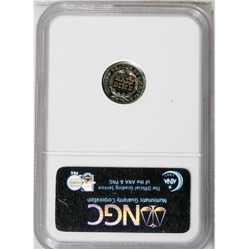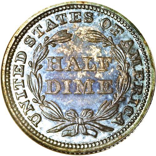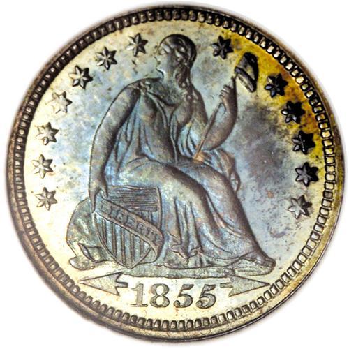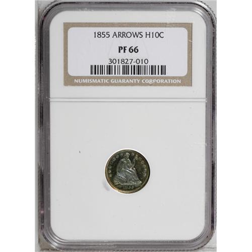 <B>1855<H10C> Arrows PR66 NGC.</B></I> Beginning in 1858, sales of proof coins to collectors increased dramatically, perhaps a reflection of the number of people who began serious collecting activity. It was about this time that the early coin dealers began operations in this country. Prior to 1858, mintages of proof coins were much smaller, with much less demand for these coins. Although a few individuals were active coin collectors in the earlier 1850s, production of proof coinage was primarily for presentation purposes to mark special occasions. Such was the case in 1855 when this lovely half dime was struck. As the Mint did not record proof production figures at the time, it is not known how many were actually struck, but it is believed that the total was limited to about 20 pieces.<BR> This lovely Premium Gem proof has deep iridescent toning over mirrored surfaces with frosty luster on the devices. Both sides exhibit a slightly mottled offering of cobalt-blue color that is accented with antique-golden at certain light angles. The design features are sharply detailed, save for several of the obverse stars. On the reverse, a small diagonal mark atop the M in DIME is actually a clash mark, seen on other examples of this issue. Sight clockwise rotation of the dies is also noted. This is one of the finest examples of this date we have had the privilege to offer. Census: 6 in 66, 0 finer (7/06).