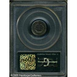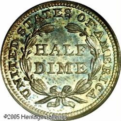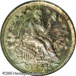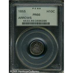 <B>1855 H10C Arrows PR66 PCGS.</B></I> While Breen states that the 1855 proof Half Dime is not quite as rare as the 1854, such a comparison has little meaning to the average collector as few numismatists have seen even one example of either date in proof format. Over the past ten years, we have only handled one 1855 (actually, the same coin on two separate occasions). There is no official or recorded mintage for this issue, but it is generally accepted that no more than 20 pieces were struck. Of that number, an estimate of 15 pieces would be a generous estimate of those surviving today in all grades. However, the population data from PCGS and NGC certainly do not support this estimate, as a casual glance at the number certified indicates that the number graded is significantly inflated by resubmissions (e.g., 6 in PR66 at NGC).<BR> This piece meets all the diagnostics for a proof, including the hollowing in the base above the left arrowhead from heavy die polishing, and the left base of the 1 about over the right edge of a dentil. But these diagnostics are of secondary importance as this coin "carries its own credentials." The fields are deeply mirrored on each side with no evidence of mint frost or lessening of the depth of mirrored reflectivity. The proof finish shines brightly through the scattered turquoise and gray toning that is seen on both obverse and reverse, and close examination fails to reveal any mentionable blemishes. However, this coin's pedigree may be traced in the future by the presence of five lint marks that radiate out of the top of the A in HALF on the reverse. A coin of great importance to 19th century type collectors and tied for finest known for the date. Lot:6157