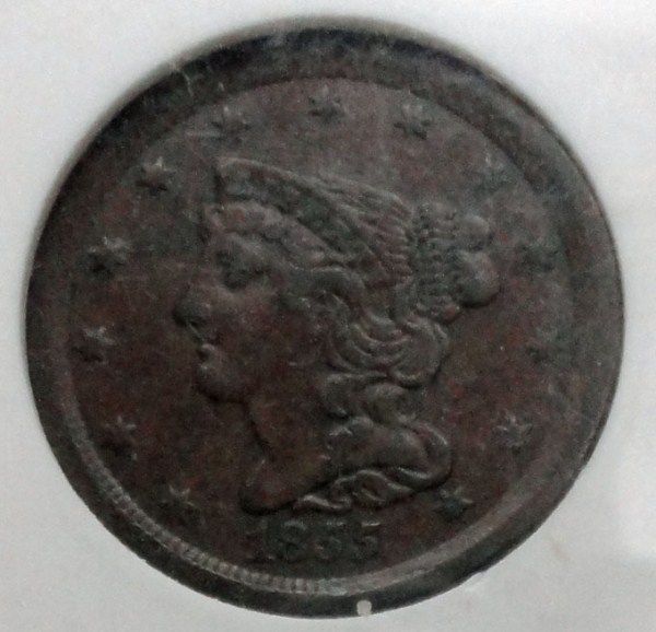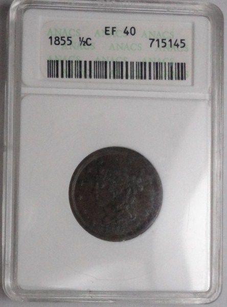 1855 HALF CENT ANACS EF40, EST. $80.00-$90.00