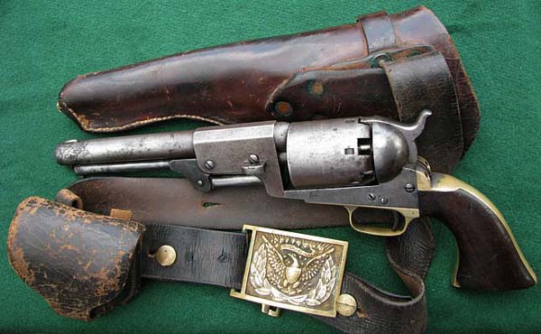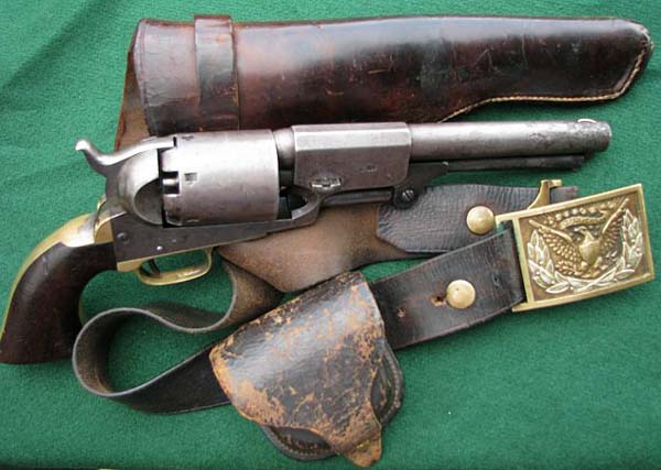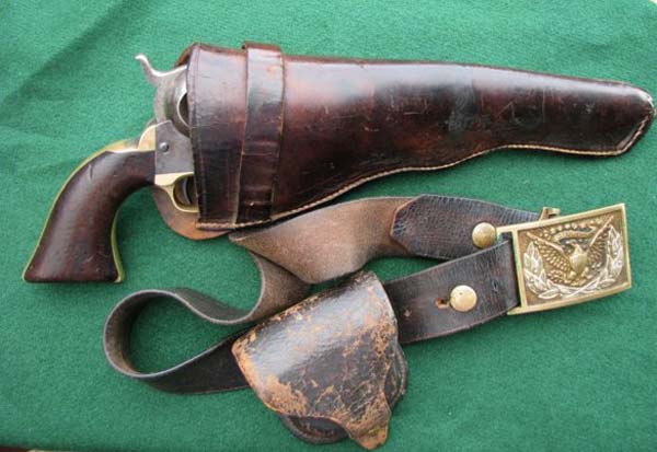 A Colt 3rd Model Dragoon, along with original period holster, belt, cartridge pouch and Civil War Officer's buckle was found in Mora County, New Mexico. Serial # 14812, Circa: 1855. It is historically reported it was worn by a member of the ''California Column'' which was made up of volunteers after the Civil War and guarded the southwest and the west for the Union. The cylinder appears to be a ''restamp'' as a replacement during it's time of use, which was very common with these big .44 calibre Colt pistols. Action is very tight with good lockup. No finish remains and the wear is consistent with age and historical use. An original and rare outfit from the American frontier. Payment by wire transfer only. Buyers Pay Actual Shipping and Handling Charges(see terms and conditions for more information).