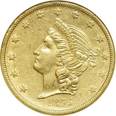 1855 Kellogg & Co (San Francisco) $20 Gold. NGC graded MS-60. Untoned. Light marks. Both sides of this attractive, fully lustrous light gold piece show the expected surface abrasions for the grade, but all seem to be small, there are no annoying deep contact marks. Always in strong collector demand. The reverse design has an eagle and shield motif similar to the standard U.S. mint-issue $20 gold pieces of the day, with blank scrolls at either side of the shield. The right claw grasps three arrows, the shield showing nearly complete vertical and horizontal stripes and lines.