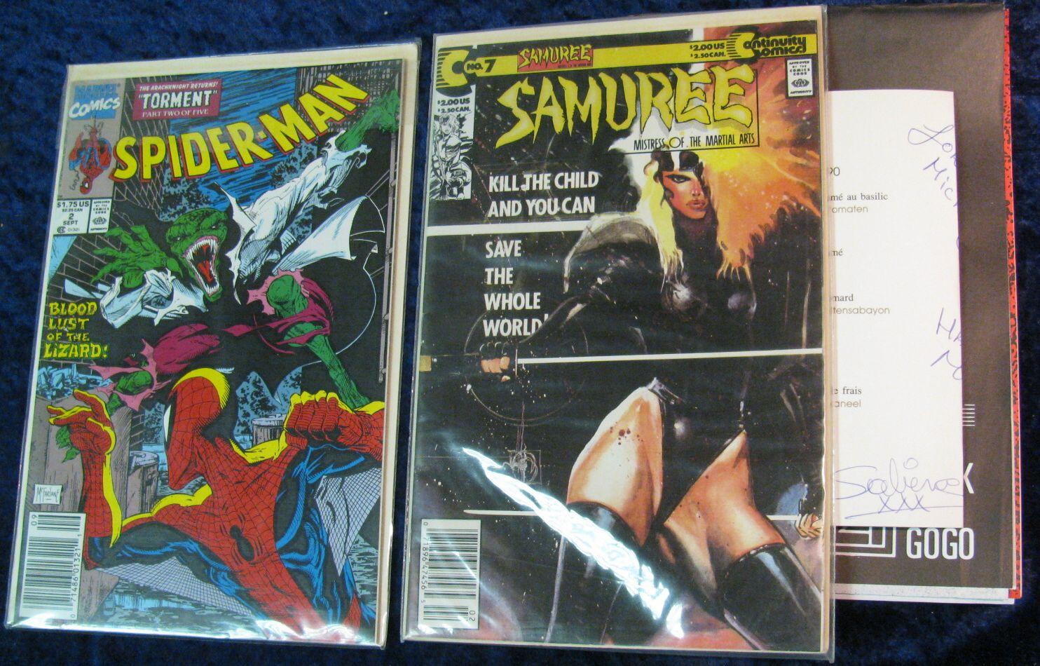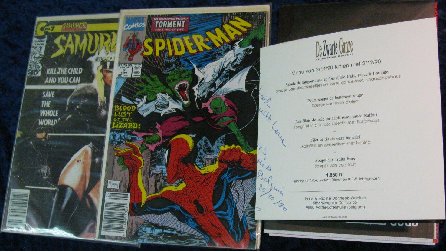 1855. Large "Dread Zeppelin" Poster; De Zwarte Ganze Menu from Belgium restaurant, autographed; First Issue "Captain Atom" Comic, mint; "Samuree" No.7 Comic, mint; & "Spider-man" no.2, mint.
