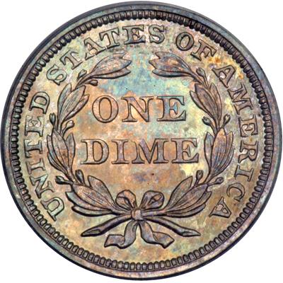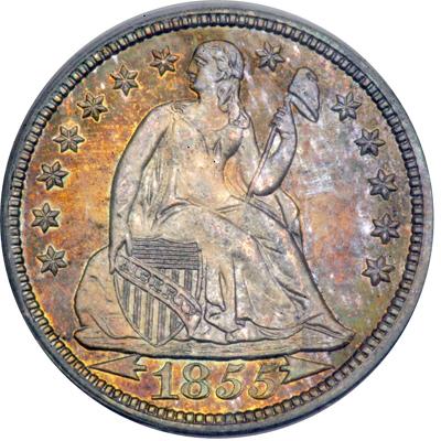 1855 Liberty Seated Dime. PCGS graded Proof 65. Nice golden toning. A lovely first-class Gem Proof with deep rich golden color, fully saturated and flickering with life over strongly mirrored Proof surfaces. The Proof 1855 Arrows Seated Liberty Dime shows up on occasion in slightly lesser grades than the much rarer 1854. This is surprising since it should really appear for sale even more frequently if its rarity were to truly predict its availability. Whittling the number down, there are probably about 30 Proofs of this date known, but only this single Proof 65 specimen graded by PCGS (Examples graded by NGC can go as high as Proof 67.) Pop 1; none finer at PCGS. (PCGS # 4744).