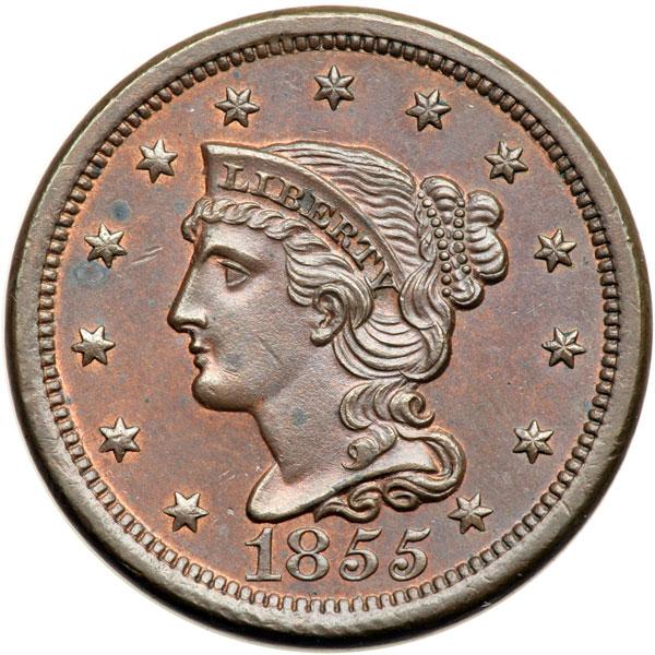 1855 N-10 R1 Italic 55 MS63. Steel brown with 15% of the mint color remaining. There is a small spot of dark toning above star 4, another fainter one under that star, and an even fainter spot of darker toning high on the neck. Sharply struck EDS, die state a. The fields are hard and reflective on both sides, but the rims are not fully squared and the mirrors are not as deep as those found on the true proof strikes (although this piece has wonderful eye appeal). DWH #3163.