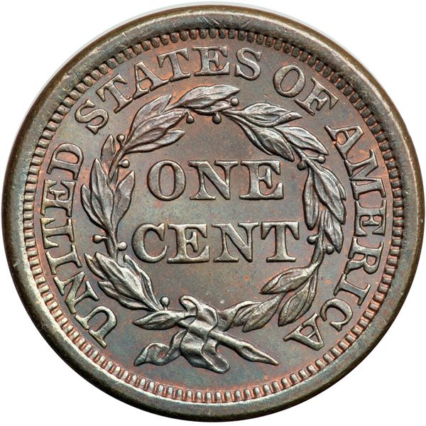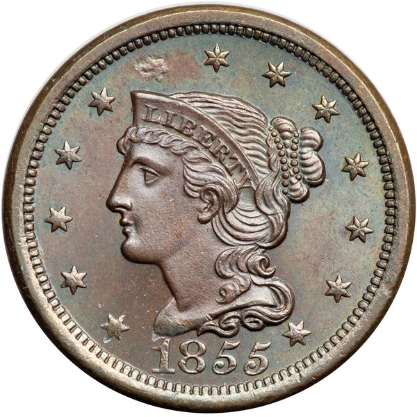 1855 N-10 R1 Italic 55 MS63. Choice frosty light olive and bluish steel with generous traces of faded mint color remaining on the reverse. The surfaces are covered with satiny mint luster and offer outstanding eye appeal for the grade. The only marks are a shallow planchet void on the rim at star 12 and a tiny nick on the rim under star 13. EDS, die state b. Star #6 is very faint thanks to a die clog in that area (the so-called 12-Star die state). Minor clogging is starting to show on the bust tip and star 1 as that area of the die is accumulating debris as well. A beautiful example that is very sharply struck everywhere except for the clogs mentioned.