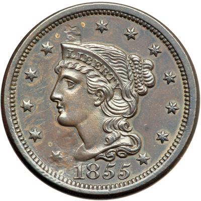1855 N-10 R1. AU-55. Italic 55. A mint state cent that was very lightly burnished and retoned glossy dark olive and steel with frosty light steel brown toning in protected areas. A tiny carbon spot resting on the right top of the D in UNITED is the only notable mark. EDS+, die state c, with star 6 missing due to a die clog and star 1 is only partially visible due to another clog that extends from that star to the bust tip, the so-called 11 and 1/2-star die state.