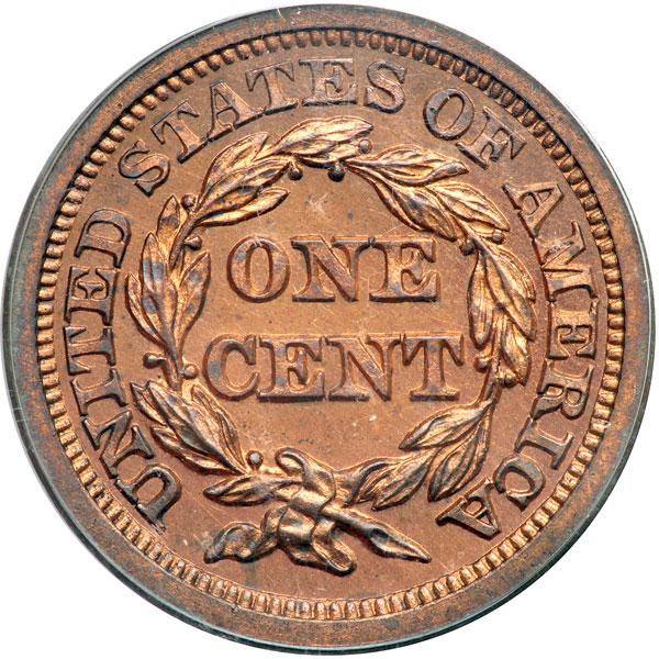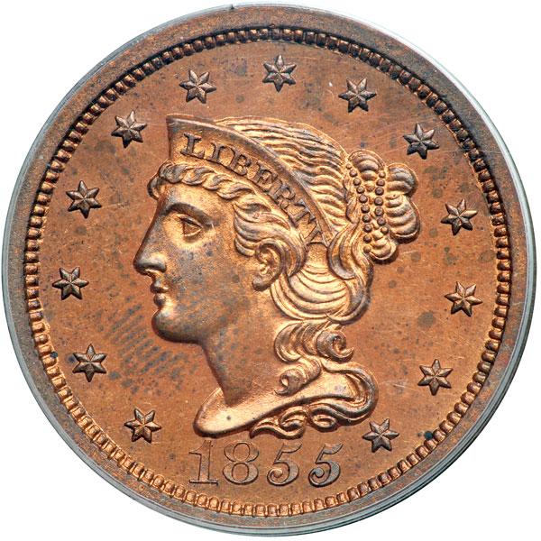 1855 N-11 R6- Italic 55 Proof-Only. PCGS graded Proof 64 Red & Brown. Very slightly faded red mellowing to bluish steel brown, about 85% of the red remaining. The fields are reflective with moderately deep mirrors on the obverse, deeper ones on the reverse. The eye appeal on the obverse is affected somewhat by a fingerprint on the neck, cheek, and in the field at stars 1-3, plus some tiny spots of darker bluish steel toning scattered about. The reverse has some of the small bluish steel spots, but it is free of fingerprints or carbon. Lots of original mint color remains and the overall eye appeal of this cent is excellent. Called Proof-63 and tied for CC#6 in the Denis Loring census of proof large cents. Our grade is Proof-62, CC#5 in the Grellman census, but this one displays the most original mint color. Comes from a long line of highly distinguished owners. The attribution and Dan Holmes provenance are noted on the PCGS label. PCGS population 1; the only Proof Red & Brown graded at PCGS for this variety. DWH #1872 (PCGS # 400598) .