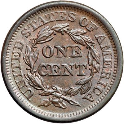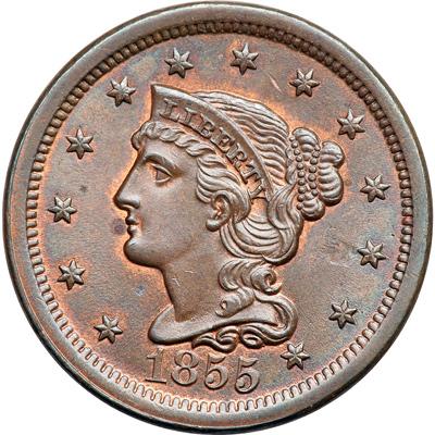 1855 N-12 R1. MS-62. Lustrous bluish steel and olive brown with 10% of the mint color remaining on the obverse, traces on the reverse. This cent is choice except for a faint spot of reddish carbon in the field before the lips. M-LDS, die state b. Tied for CC#8.
