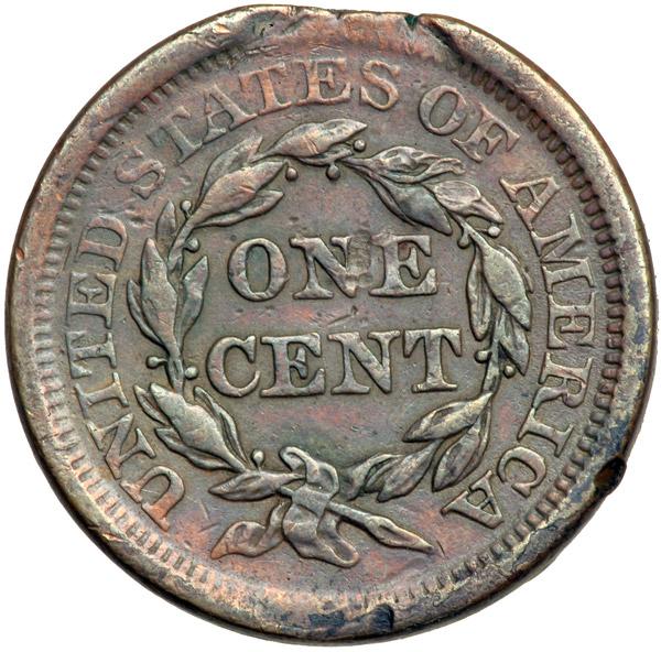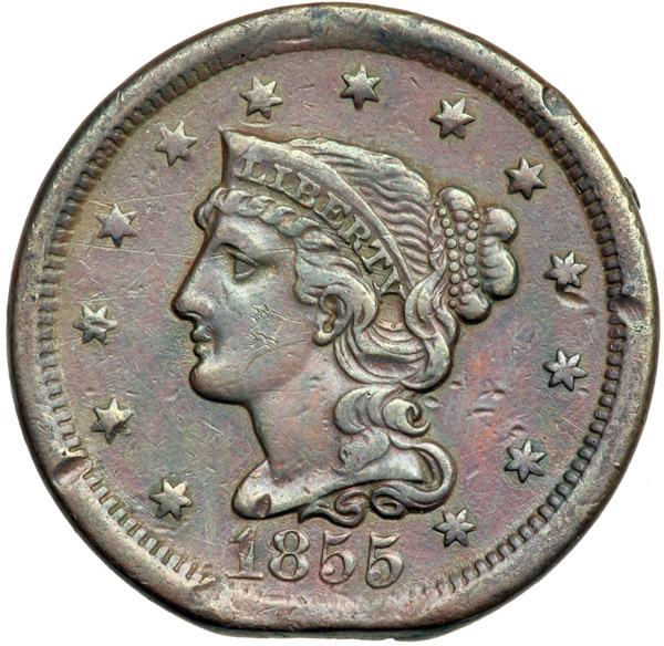 1855 N-3 R1 F15. Clipped Planchet. Sharpness VF30 with a half dozen rather strong rim nicks plus other lighter contact marks scattered about both sides. Lightly cleaned and retoned a mostly glossy reddish steel brown and chocolate. A planchet clip affects the dentils under the date and over TES. The dentils across from the clip are weakly struck, the Blakesly effect found on cents struck on clipped planchets. DWH #3360.