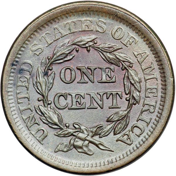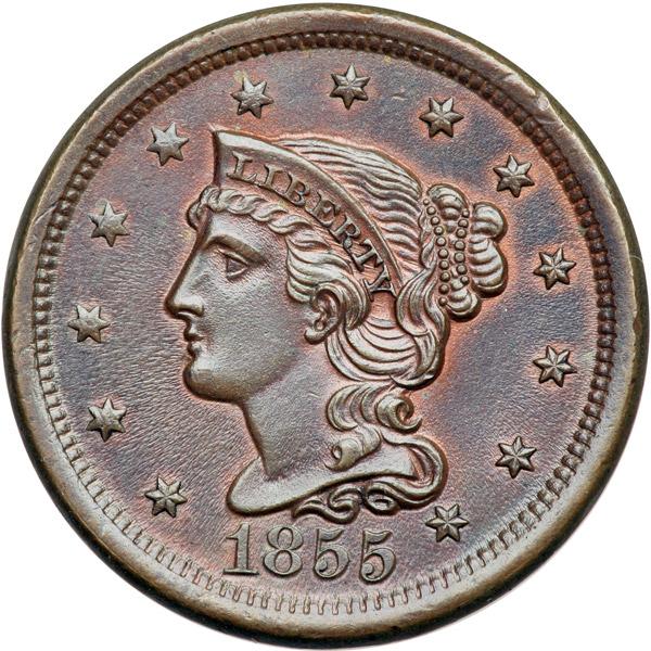 1855 N-3 R1 Upright 55 AU55. Mint state sharpness but dipped long ago and now retoned a natural-looking lustrous olive brown and chocolate with traces of lighter reddish steel brown in protected areas. Some small spots of darker toning around the D in UNITED are the notable marks. MDS, die state b. A relatively humble cent but it comes with a nice provenance.