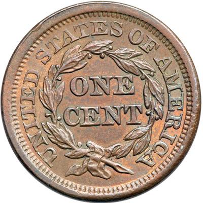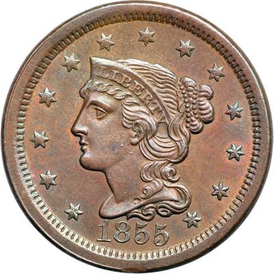 1855 N-4 R1 PCGS graded "Genuine". Frosty medium brown with reddish tan toning in protected areas, possibly from a light chemical cleaning long ago. No spots or stains. The only marks are a small planchet flake on the bottom of the neck above the first 5 in the date, a minor scrape on the rim under the 85, and a light rim bruise at the first T in STATES. Nicely struck EDS, die state a, the usual hoard die state for this variety. Our grade is MS60.