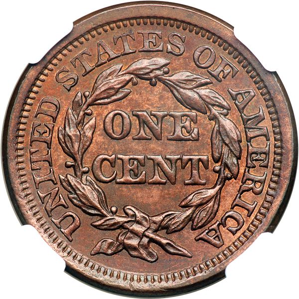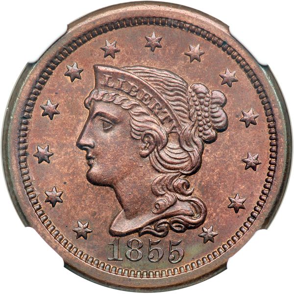 1855 N-4 R1 Upright 55. NGC graded MS-62 Brown. Slightly lustrous light steel brown and chocolate with underlying faded mint color bleeding through in the fields and protected areas. Possibly dipped long ago and retoned. No spots or other defects. Nicely struck EDS, die state a (the usual hoard die state). Our grade is MS60.