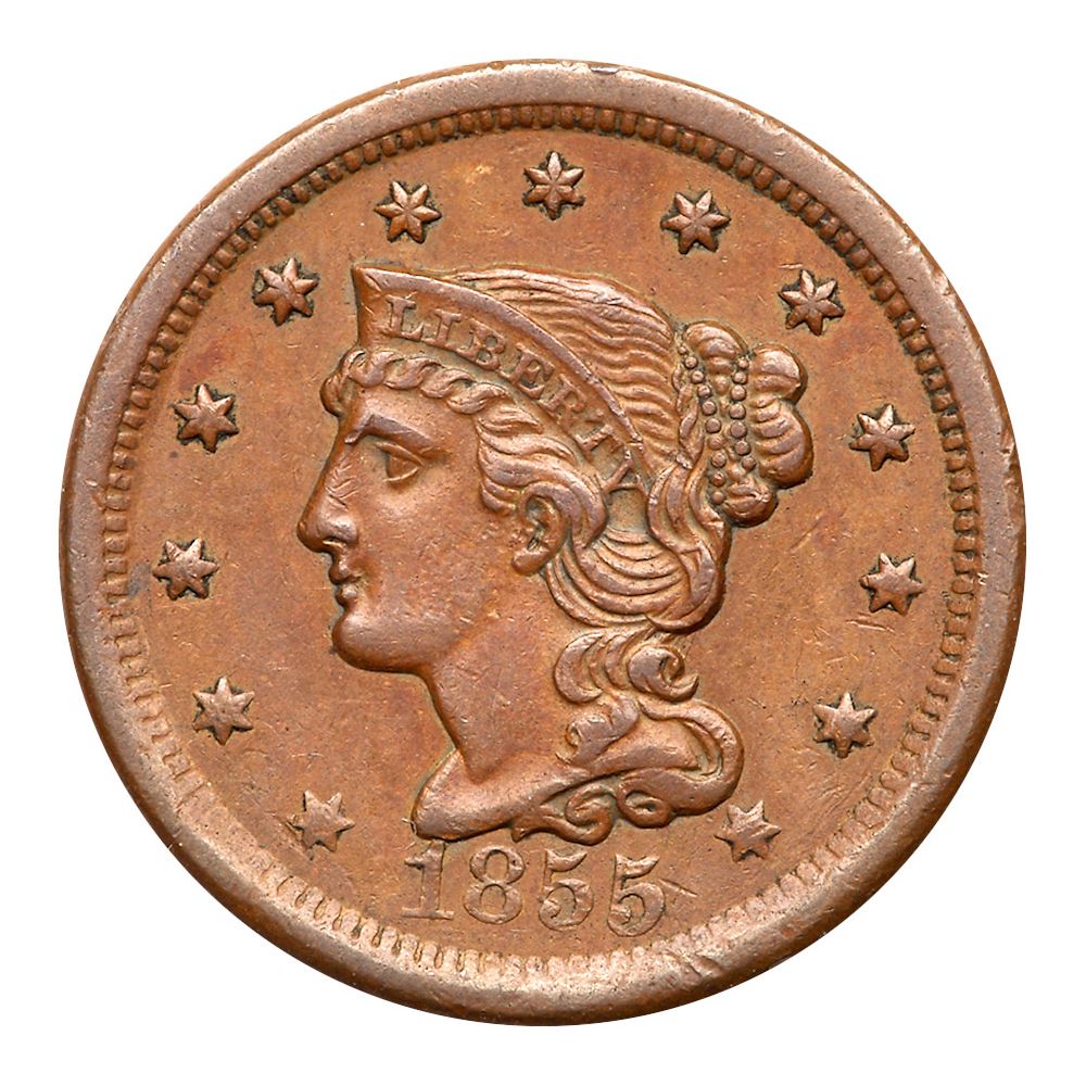 1855 N-5 R5- Upright 55 VF35+. Choice frosty light to medium brown. No spots or stains, only trivial ticks and light wear. The only notable mark is a small nick on the rim right of the date. A nice cent, close to EF40. MDS, die state b. Estimated Value 175 - UP