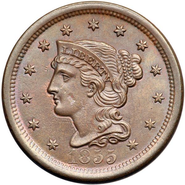 1855 N-7 R1 MS60. Lustrous light bluish steel brown with a trace of mint color on the obverse. There is a shallow planchet void or low spot in the center of the cheek, as struck, plus some tiny pinpricks in the field off the browlock. Otherwise the surfaces are satiny and free of defects. LDS, die state d, with a faint die crack through the top of MERIC, clearest at RI. The fields are flowlined and the date is weak from die wear. Not in the overall condition census but finest of the late state in the Grellman census. Removed from an NGC slab graded MS64BN (NGC label included). DWH #2347.