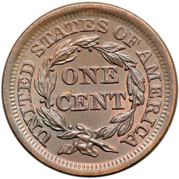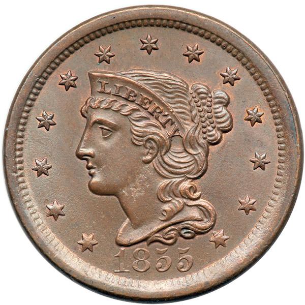 1855 N-7 R1 MS62. Frosty light bluish steel brown and chocolate with faded mint color showing in protected areas on both sides. No spots, stains, or contact marks. The only defect is a shallow low spot (caused by debris on the die) high on the neck. Otherwise this piece is choice. MDS, die state c. Tied for CC#7 in the Grellman census.