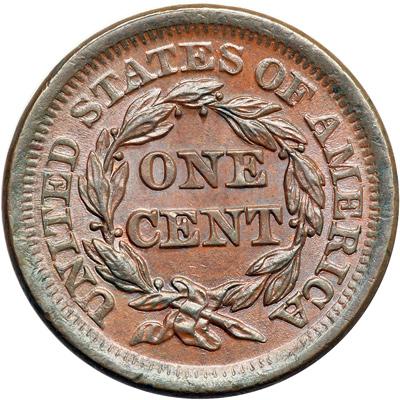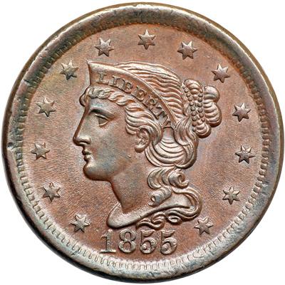 1855 N-8 R2+. AU-58. Lustrous light chocolate and steel with darker steel brown toning on the highpoints and a tiny peep of mint red showing on the reverse. Very close to mint state. A small rim nick under star 1 and another at star 3 are the only notable marks. MDS, die state b.