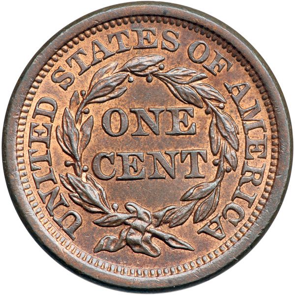 1855 N-9 R1 Italic 55, Knob-on-Ear MS63. Lustrous bluish steel and olive with at least 25% of the mint red remaining, mostly on the reverse. No notable signs of contact and excellent eye appeal for the grade. The only marks are a spot of darker toning on the right side of star 9 and another smaller one on the left top of the E in STATES. MDS, die state d early. The "Knob" break at the top of the ear is partially but not completely risen. A very nice example of this popular "Redbook" variety.
