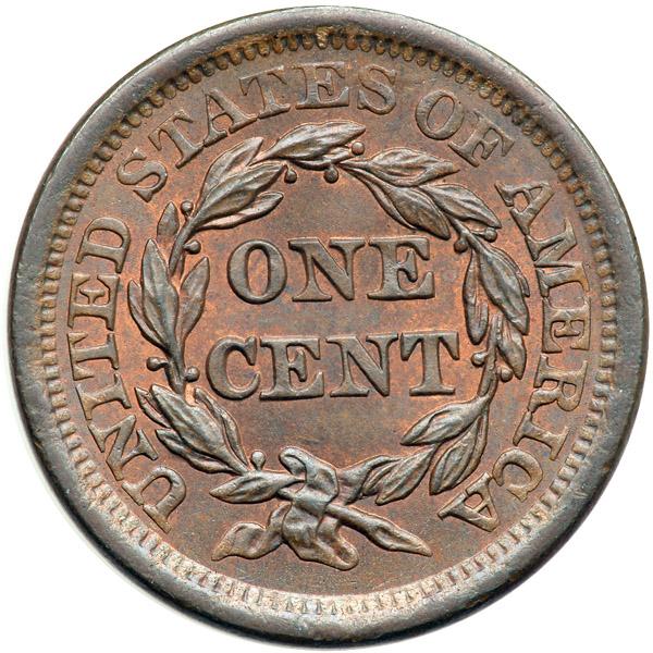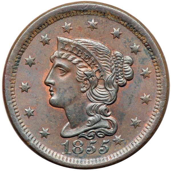 1855 N-9 R1 Knob-on-Ear MS63. Lustrous bluish steel and chocolate with slightly mellowed mint red covering the protected areas on both sides. The surfaces are satiny and offer excellent eye appeal. A subtle swipe of darker steel and olive toning from the dentils right of star 9 to the curl over star 13 is a good identifying mark. MDS, die state d. The "Knob" break over the ear is clearly raised, but the branch under the adjacent Y has not formed. A couple fine cracks do extend a short way down from the base of the Y indicating the branch is just beginning.