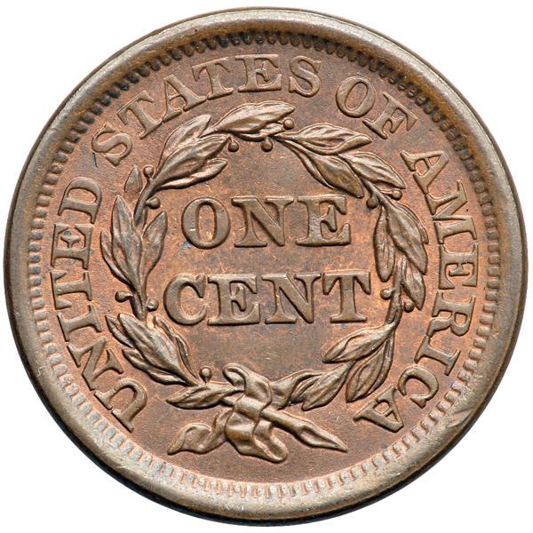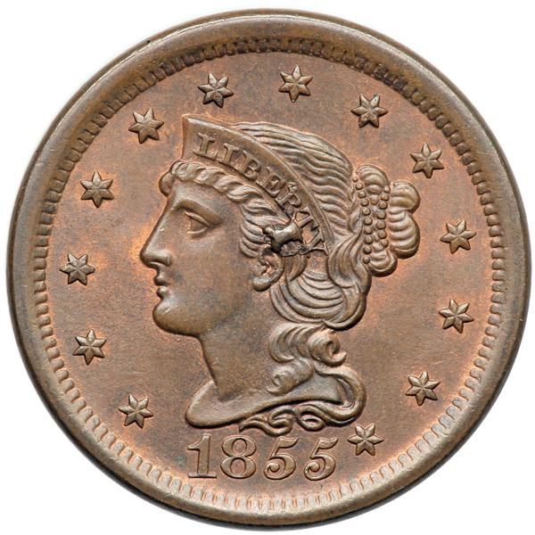 1855 N-9 R1 Knob-on-Ear MS63. Choice frosty light steel brown and tan with faded mint red covering 15% of the planchet. Both sides are satiny. A beautiful example, flawless except for a dull, shallow nick on the rim over the C in AMERICA. M-LDS, die state f early. The "Knob" atop the ear is bold and the branch under the Y is fully outlined and slightly raised. A really nice example of this very popular "Redbook" variety. And the later die state is a big plus (after all, size matters).