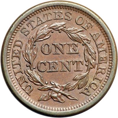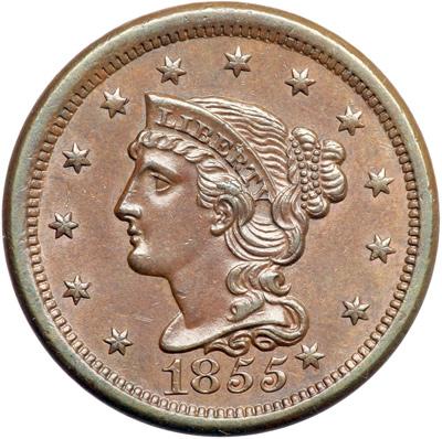 1855 N-9 R1. AU-55. Italic 55 with Knob-on-Ear. Very attractive glossy medium brown and light chocolate with satiny mint frost covering the protected areas on both sides. No spots or stains, only very light friction on the highpoints of the design. Great eye appeal. There is a dull, light nick on the front edge of the neck and a tiny pinprick near the dentils under the wreath stem. MDS, die state d early. The knob break under the T in LIBERTY is partially raised.