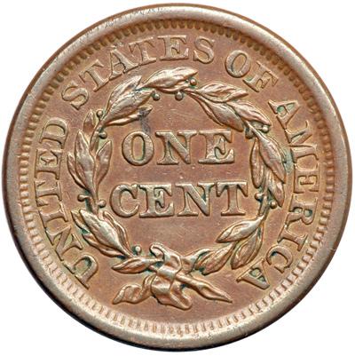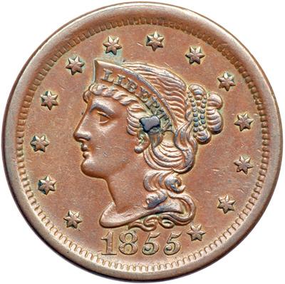 1855 N-9 R1. EF-40. Italic 55 with Knob-on-Ear. Glossy light chocolate brown with darker olive brown toning on the highest points on the obverse, particularly on the knob break. Frosty lighter golden brown and tan toning shows in the protected areas on both sides. No notable signs of contact. M-LDS, die state f, with the knob break under the T fully raised and the branch under the adjacent Y partially raised. A nice example of the variety with a bold knob.