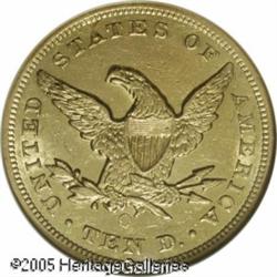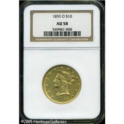 <B>1855-O $10 AU58 NGC.</B></I> As nice as this date can readily be found, with NGC showing none graded finer of this scarce issue. Of the 18,000 struck most entered circulation and very few were saved in high grades. This coin shows a few scattered handling marks but no deep or distracting nicks which are so often found on lower grade coins. The strike is sharp throughout, and the only identifying item seen is a small planchet void at the top of the A in STATES. One for the date specialist who demands eye appeal as well as excellent condition. Population: 14 in 58, 0 finer (1/05). Lot:8751