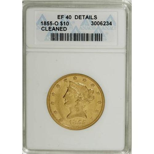<B>1855-O $10 --Cleaned--ANACS. XF40 Details.</B></I> The 1855-O is a difficult No Motto issue with a low mintage of 18,000 pieces. Although once lightly wiped, this partly lustrous example has only moderate wear on the curls and wings.<BR><BR><B>Coin Engraver:</B> Christian Gobrecht<BR><BR><b>Shipping:</b> Coins & Currency (<a target="_blank" href="http://www.heritageauctions.com/common/shipping.php">view shipping information</a>)