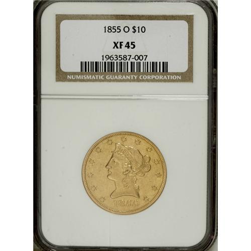 <B>1855-O $10 XF45 NGC.</B></I> Most pieces of this early O-mint eagle issue average about Choice XF, including the present piece. It does, however, offer a fairly bold strike that shows weakness confined largely to the eagle's neck and right (facing) wing, with good articulation elsewhere. While the field reveal numerous undistracting, grade-consistent ticks, there are no singular abrasions, and the orange-gold color is quite appealing.<BR><BR><b>Shipping:</b> Coins & Currency (<a target="_blank" href="http://www.heritageauctions.com/common/shipping.php">view shipping information</a>)