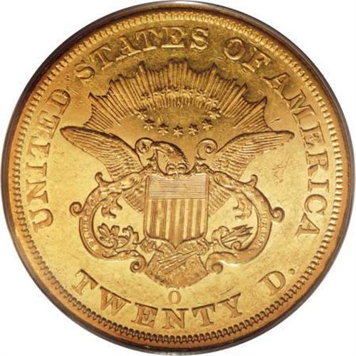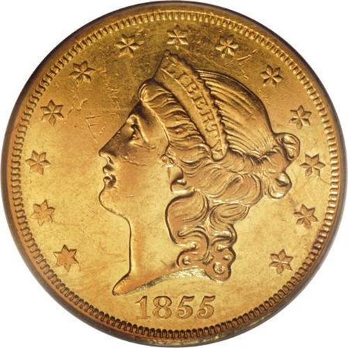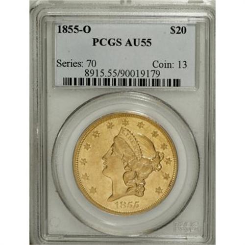 <B>1855-O $20 AU55 PCGS.</B></I> The 1855-O, sandwiched between two of the most elusive double eagle issues ever produced, is a coveted issue in its own right. With a mintage of just 8,000 pieces and an estimated survival rate of 1%, according to figures given by Winter (2006), it ranks as the least available of the second-tier New Orleans double eagle rarities, and any piece Extremely Fine or above is a condition rarity.<BR> This Choice AU representative is one of the finest examples of the 1855-O available today. The pale green-gold fields show strong, distinctly reflective luster that is largely unaffected by the coin's minor wear. Both sides show better-than-average detail, and on the obverse, even the often-weak left stars have visible lines and centers. While the margins display scattered abrasions and a planchet flaw is noted to the left of Liberty's neck, the overall eye appeal is better than the grade might suggest, as the coin shows fewer marks than usual on the portrait. Population: 4 in 55, 2 finer (8/07).<BR><I>From The Arroyo Grande Collection.</B></I><BR><BR><B>Coin Engraver:</B> James B. Longacre<BR><BR><b>Shipping:</b> Coins & Currency (<a target="_blank" href="http://www.heritageauctions.com/common/shipping.php">view shipping information</a>)