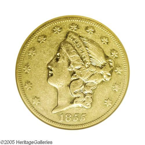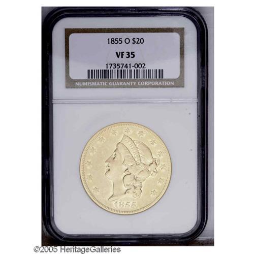 1855-O $20 VF35 NGC. Only 8,000 pieces were struck of 1855-O[$20] VF35 NGC.