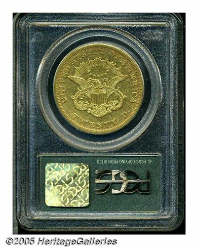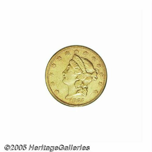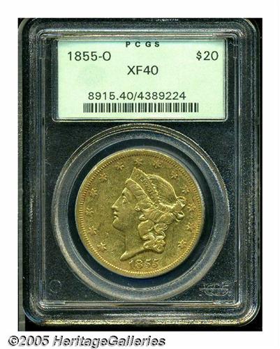 <B>1855-O<$20> XF40 PCGS.</B></I> Typically abraded with some of the original luster intact and hints of red color about the borders. The 1855-O, while not drawing the attention received by the New Orleans issues in the preceding and following years, is a very scarce coin in its own right, particularly when its comes to condition rarity. The present example is above average for the date and should encounter strong bidder interest.
