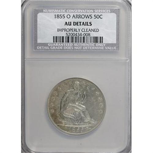 <B>1855-O 50C Arrows--Improperly Cleaned--NCS. AU Details.</B></I> NGC Census: (0/0). PCGS Population (0/0). Mintage: 3,688,000. (#6283)<BR><BR><B>Coin Engraver:</B> Christian Gobrecht<BR><BR><b>Shipping:</b> Coins & Currency (<a target="_blank" href="http://www.heritageauctions.com/common/shipping.php">view shipping information</a>)