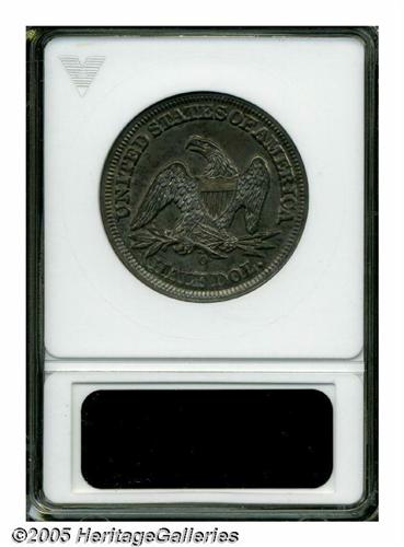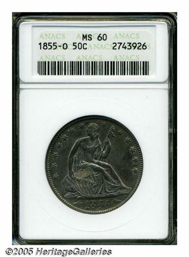 <B>1855-O<50C> Arrows MS60 ANACS.</B></I> The 1855-O is generally considered as a New Orleans type coin, along with the 1854-O, although the '55-O had a significantly lower mintage. This piece has variegated charcoal toning over each side and good luster with no abrasions that are identifiable without magnification.