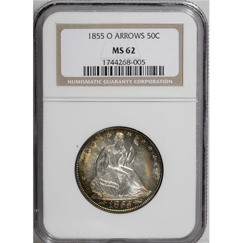 <B>1855-O<50C> Arrows MS62 NGC.</B></I> Gold and russet peripheral toning surrounds the brilliant and highly lustrous centers. A sharply struck coin with moderate field abrasions.
