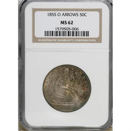<B>1855-O 50C Arrows MS62 NGC.</B></I> A popular mintmarked variant of the short-lived Arrows type. This piece shows rich reddish-brown patina over both sides with small portions of blue at the obverse periphery. Weakly impressed on the obverse stars, otherwise fully defined.<BR><BR><B>Coin Engraver:</B> Christian Gobrecht<BR><BR><b>Shipping:</b> Coins & Currency (<a target="_blank" href="http://www.heritageauctions.com/common/shipping.php">view shipping information</a>)