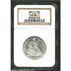 1855-O 50C Arrows MS63 NGC. Full mint frost with the slightest touch of peripheral softness in the 1