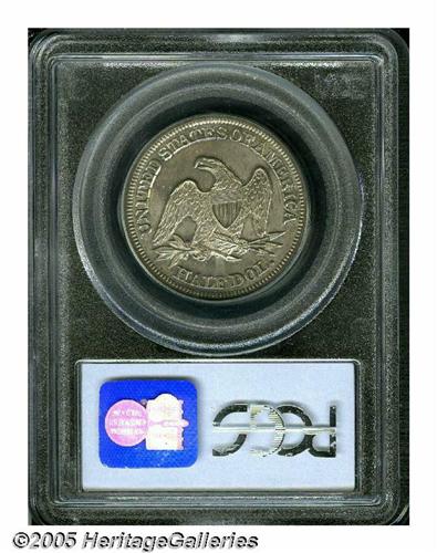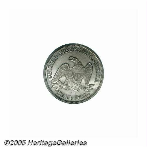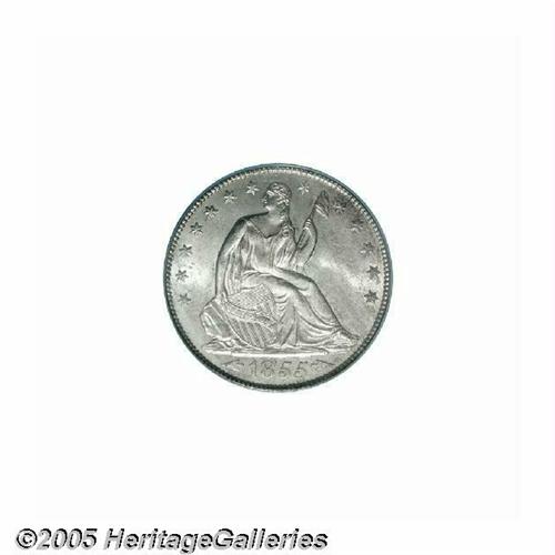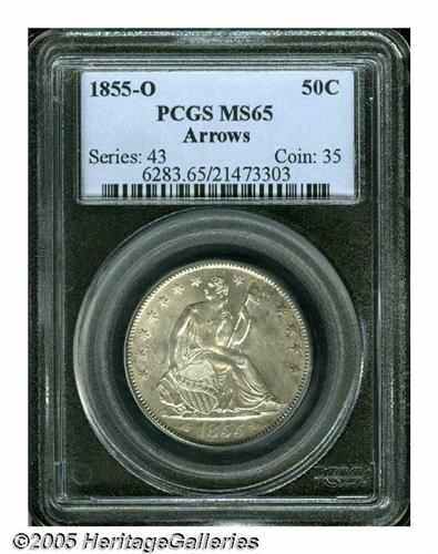 <B>1855-O<50C> Arrows MS65 PCGS.</B></I> Variegated olive and pearl-gray colors invigorate this needle-sharp and lustrous Gem. Attractively preserved despite a short pinscratch near the RI in AMERICA. Important as a New Orleans Mint type coin, although the 1855-O Arrows has a lower production than its 1854-O Arrows predecessor. Very scarce in better Mint State grades. Population: 15 in 65, 6 finer (5/05).