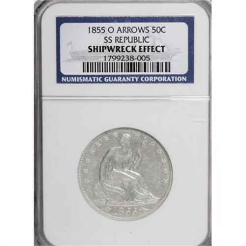 <B>1855-O 50C Arrows--Shipwreck Effect--NGC.</B></I> <I>Ex: S.S. Republic. </B></I>Bright untoned surfaces reveal light to moderate porosity, and some obverse hairlines. Some highpoint wear.<BR><BR><B>Coin Engraver:</B> Christian Gobrecht<BR><BR><b>Shipping:</b> Coins & Currency (<a target="_blank" href="http://www.heritageauctions.com/common/shipping.php">view shipping information</a>)
