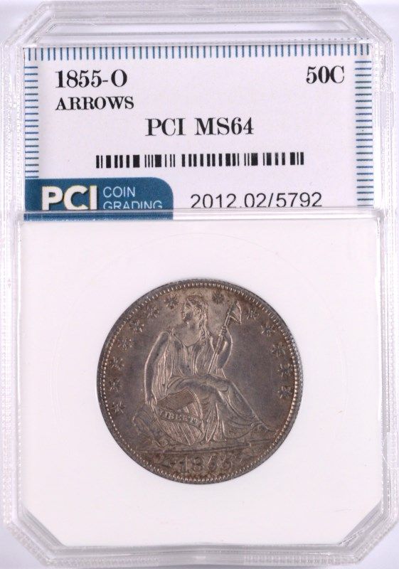 1855-O ARROWS SEATED HALF DOLLAR, PCI MS-64, BEAUTIFUL COLOR, NEVER CLEANED!