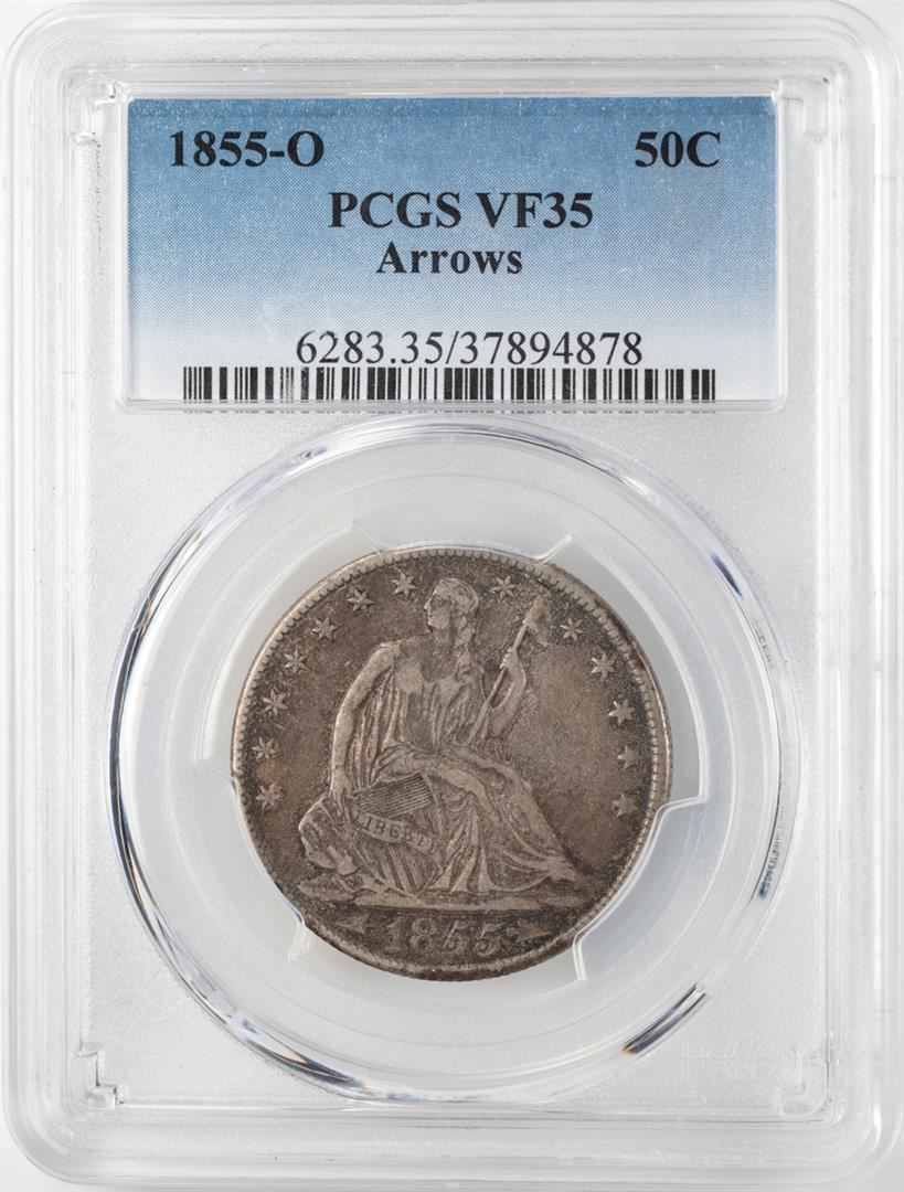 One 1855-O Arrows Seated Liberty Half Dollar Coin PCGS VF35. PCGS Graded.