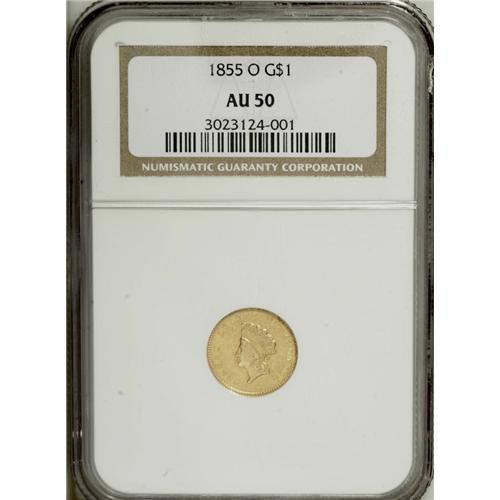 <B>1855-O G$1 AU50 NGC.</B></I> A rather pleasing New Orleans issue, with bright yellow-gold surfaces exhibiting a faint greenish cast. Nicely defined, except for weakness in the 8 of the date. Some wispy circulation marks are noted on each side.<BR><BR><b>Shipping:</b> Coins & Currency (<a target="_blank" href="http://www.heritageauctions.com/common/shipping.php">view shipping information</a>)