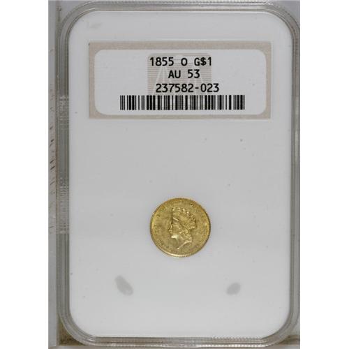<B>1855-O<G$1> AU53 NGC.</B></I> A lightly worn piece with still-lustrous yellow-green surfaces. A typically struck example that displays a few scattered handling marks.