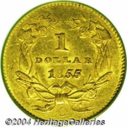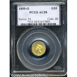 <B>1855-O<G$1> AU58 PCGS.</B></I> A rather high grade for this moderately scarcer issue whose popularity is based on it being the only New Orleans Type Two Gold Dollar as well as the final year of issue from this mint. Softly struck in the centers, as usual, but not die clashed as most we have seen. Slightly muted surfaces. <BR><BR><B>Important notice:</B> Heritage usually auctions material at the rate of 200-250 lots per hour. On some occasions eBay Live bid software or the Internet may not be able to keep up with the pace of the auction. We recommend placing a realistic absentee bid now as insurance to avoid disappointment. Occasionally the auctioneer may eliminate or reject an eBay Live bid, and the auctioneer may also reopen a lot after the close of the eBay live bidding (usually because we missed an audience bid), and may reject your bid even if it shows you as the winning bidder. By bidding via eBay Live, you agree that Heritage may award the lot to another bidder at its sole discretion under the circumstances described above or any other reasonable circumstances. Since eBay bids are not shown to us until we open the lot on the floor, we treat those bids just like floor bids. In most cases the floor responds before the eBay bid is presented to us, due to Internet lag time, so for consistency we have made it a policy that floor bids are always considered first over tie eBay live bids. Also please note that all Heritage lots purchased through eBay Live carry a 20% Buyer's Premium. Please make sure you read the Terms and Conditions before you bid. </span></font></tr></table></td></tr></table>