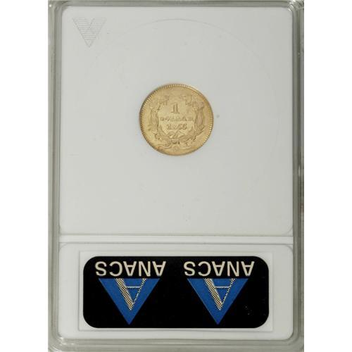 <B>1855-O G$1 --Damaged, Cleaned--ANACS. AU53 Details.</B></I> Variety One. A lightly worn and shiny yellow-gold representative of the only Type Two New Orleans gold dollar issue. The usual clash marks are present on the reverse, while the obverse has an area of damage below the A in STATES.<BR><BR><b>Shipping:</b> Coin/Currency (<a target="_blank" href="http://www.heritageauctions.com/common/shipping.php">view shipping information</a>)