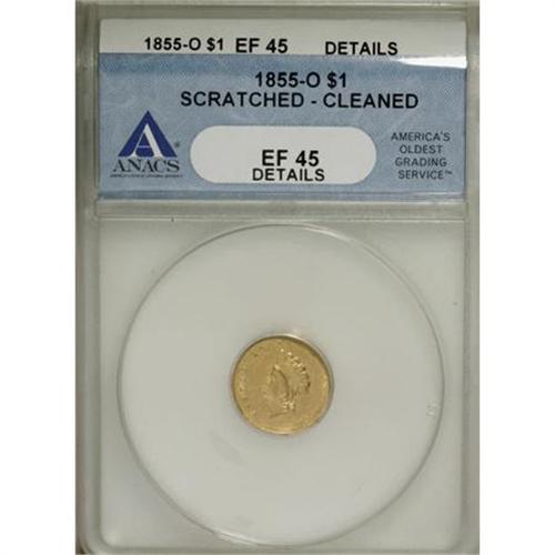 <B>1855-O G$1 --Cleaned, Scratched--ANACS. XF45 Details.</B></I> NGC Census: (27/406). PCGS Population (27/212). Mintage: 55,000. Numismedia Wsl. Price for NGC/PCGS coin in XF45: $1,095. (#7535)<BR><BR><B>Coin Engraver:</B> James B. Longacre<BR><BR><b>Shipping:</b> Coins & Currency (<a target="_blank" href="http://www.heritageauctions.com/common/shipping.php">view shipping information</a>)