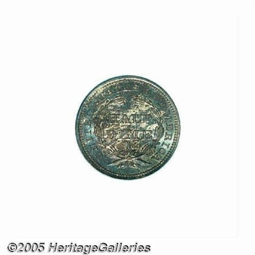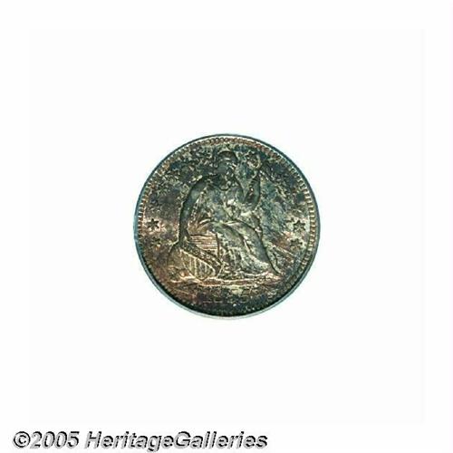 <B>1855-O<H10C> Arrows MS63 PCGS.</B></I> Even though 600,000 pieces were struck of the 1855-O half dime, it is an issue that was heavily circulated with few examples remaining today in the better grades of Mint State. We try to not speculate too much about possible upgrades of coins, but this piece certainly looks finer than the stated grade. Well struck, the surfaces are covered with streaks of deep moss-green, crimson, and russet toning.
