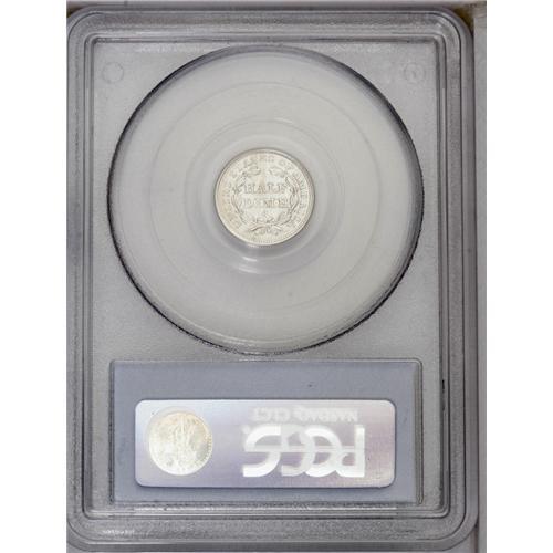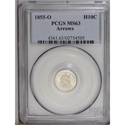 <B>1855-O<H10C> Arrows MS63 PCGS.</B></I> With an original mintage of just 600,000 coins, the 1855-O is the most elusive Seated half dime of the Arrows type. The present representative is devoid of mentionable toning with essentially distraction-free surfaces. The obverse has a highly frosty texture, while the reverse is satiny. The obverse exhibits several interesting die cracks and a few faint striations in the fields. Population: 10 in 63, 20 finer (2/06).