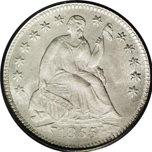 <B>1855-O<H10C> Arrows MS67 PCGS.</B></I> Several varieties are known from six obverse and four reverse dies. Distinguishing between these varieties is primarily based on date and arrow positions. The present example has large arrows to the left and right of the date, and they are placed high in the exergue, overlapping the rock below Liberty. The shafts of these arrows are level with the top of the date, and both extend nearly to the border. In fact, the combined length of the two arrowheads is greater than the width of the date. The obverse of this example is lapped, heavily rusted, and it extensively cracked. Die cracks join every star on both sides to Liberty's head and the cap, with a heavy die chip on the top surface of the cap. The obverse is also heavily rusted, visible primarily on the devices as die lapping diminished the appearance of die rust in the fields. The lapping process also removed some of the design detail above the arrowheads. The reverse is a newer die with clash marks visible inside the wreath, but no evidence of die cracks or rust. Diagonal die file marks slant down from the border dentils to the tops of TED S. This Superb Gem is remarkably well detailed and it is fully brilliant with bright silver surfaces. The obverse has frosty luster due to the die rust, and the reverse has satiny luster. Neither side has any noticeable marks on the essentially pristine surfaces. Population: 1 in 67, 0 finer (4/06).