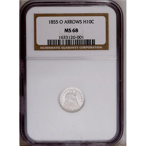 <B>1855-O<H10C> Arrows MS68 NGC.</B></I> An extraordinary Gem boasting silver-white color throughout and abounding luster. Magnification reveals that both dies were boldly clashed. The obverse die shows evidence of rust, a die crack that circles through all stars and the devices (with other smaller cracks), and extensive lapping that was perhaps intended to partially remove the rust and clashmarks. The branch Mints sometimes had to suffer with less than perfect equipment and in this case, the New Orleans Mint employed the obverse die well beyond its normal life. Nevertheless, this amazing coin captures and displays these challenges with near perfection. The pinnacle grade awarded by either service for this date and mint is MS68, and only two other coins have attained this stratospheric status. Considering that 600,000 pieces were coined and few were saved at the time of issue, such a state of preservation is close to miraculous. The With Arrows type is elusive and in high demand, particularly in Gem or higher grades. Close examination of the surfaces shows a tiny, nearly vertical identifying nick on Liberty's cheek, and a minor hairline slide between the S and T of STATES. An exciting opportunity for the specialist who desires the finest grade for this date and mint. Census: 3 in 68, 0 finer (1/06).