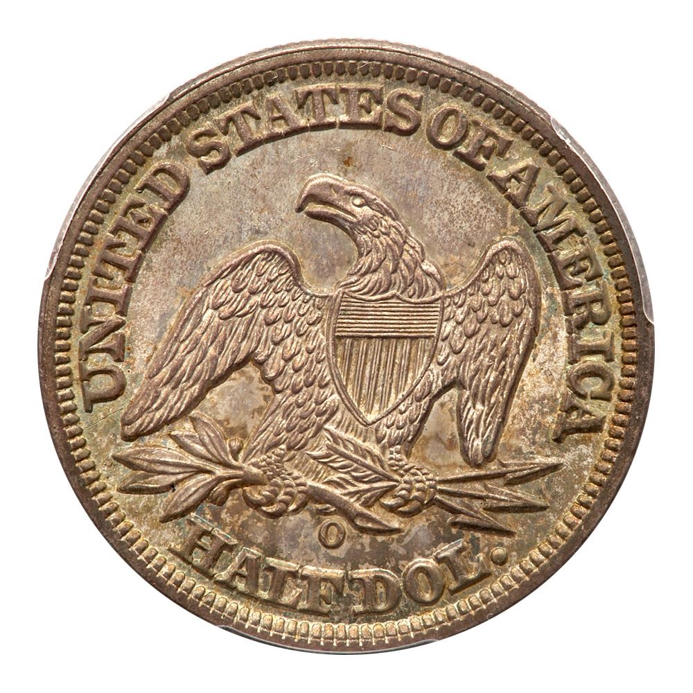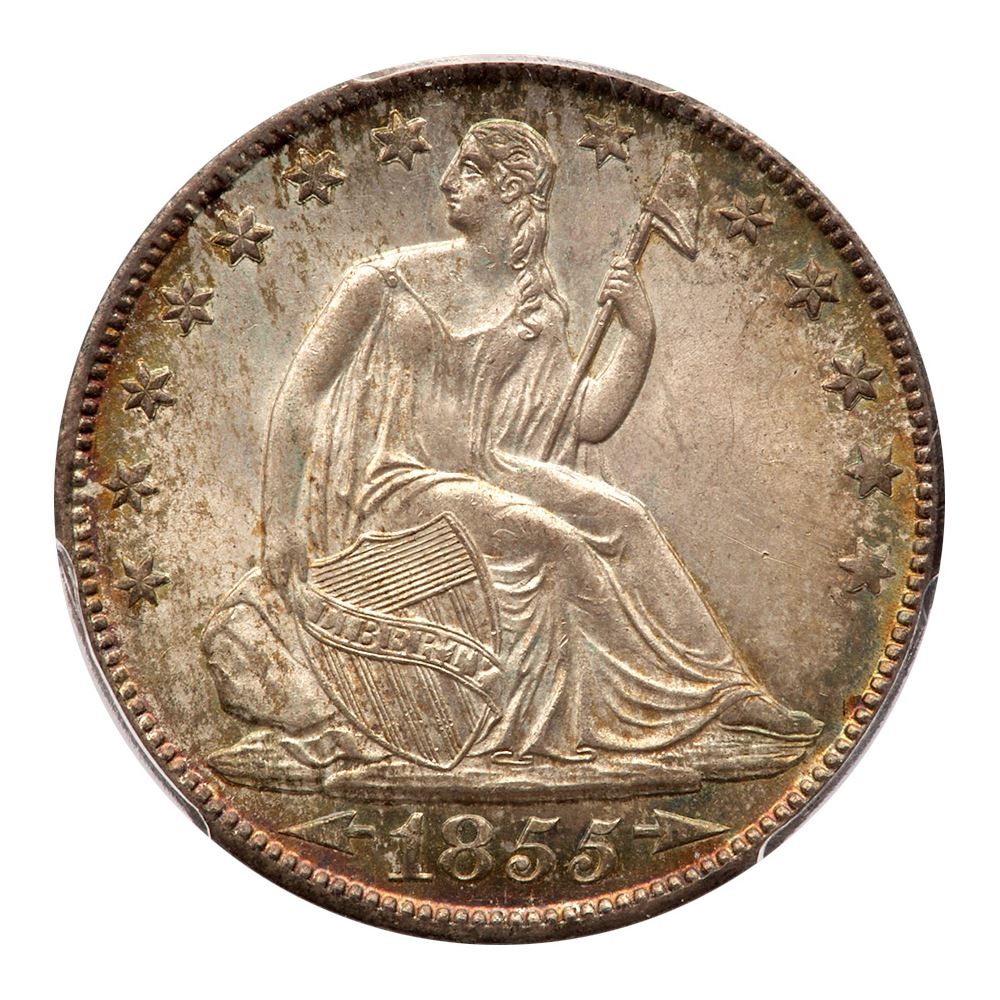 1855-O. Arrows. PCGS graded MS-66. Important as a type coin for the Arrows at the date, and these were only issued in 1854 and 1855, in 1853 the Arrows were also used, but included glory rays around the eagle on the reverse as a single year type coin. This one is certainly one of the absolute finest known with a bold strike, striking and colorful toning and glorious luster. Nice light toning on both sides. A lovely coin. Pop 6; 4 finer, 2 in 66+, 2 in 67. PCGS # 6283 Estimated Value 10,000 - 12,000